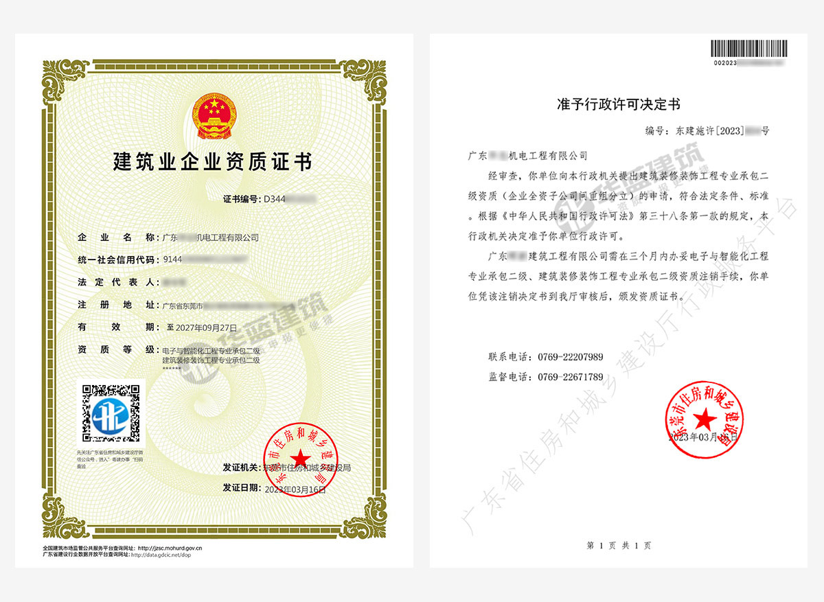 申报分立的电子与智能化工程专业承包二级、建筑装修装饰工程专业承包二级资质证书成功获批!