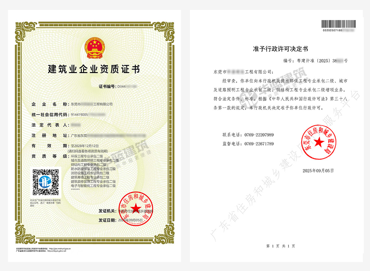 东莞企业申报的环保工程专业承包二级、城市及道路照明工程专业承包二级、钢结构工程专业承包二级(增项资质)资质证书申报通过,顺利获批!