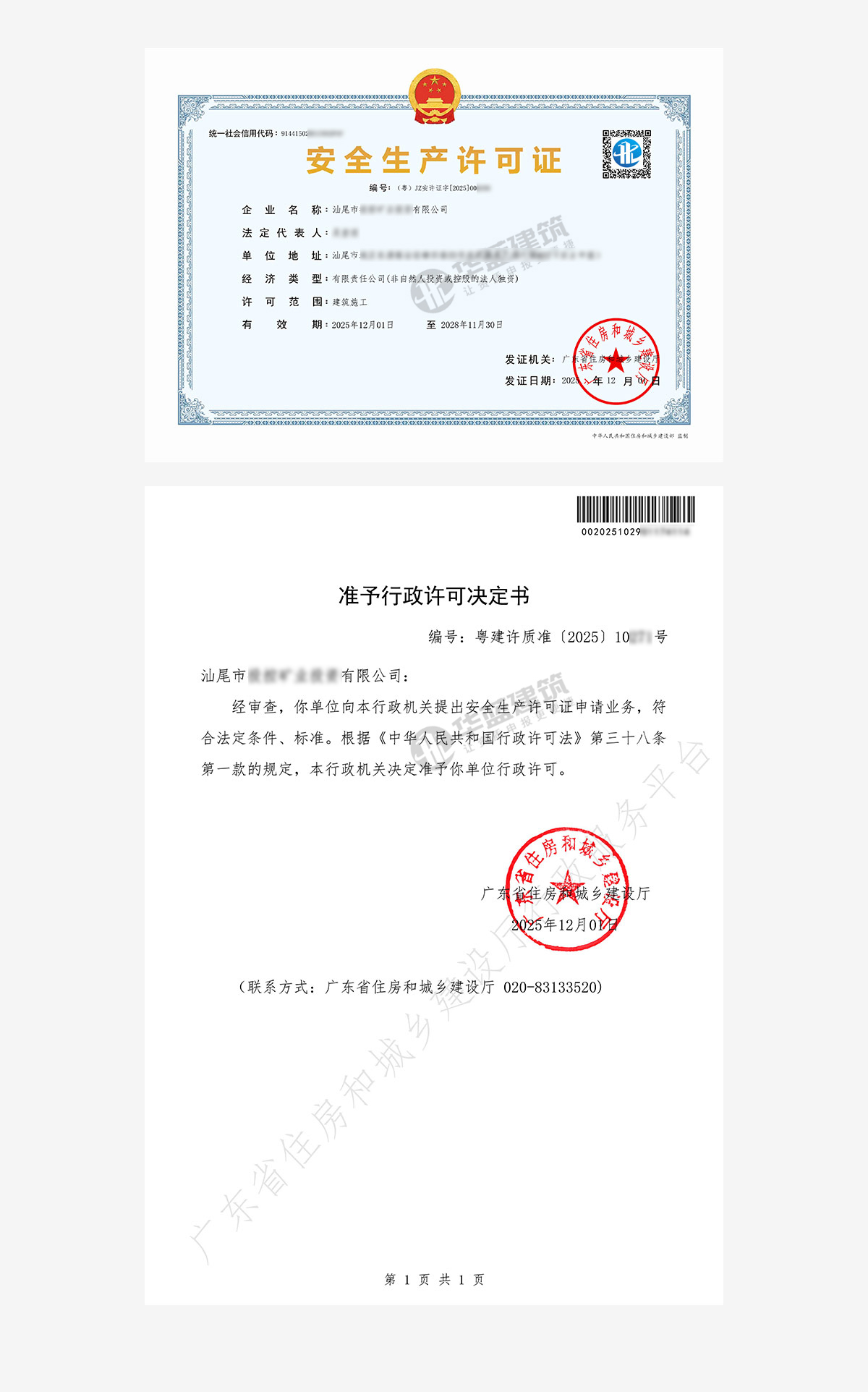 汕尾企业申报的劳务不分等级安全生产许可证(首次申请)资质证书申报通过,顺利获批!